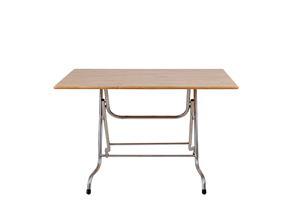 Bàn gấp khung inox 201 toàn bộ, mặt bàn gỗ cao su thép thanh, các viền cạnh được bo R đảm bảo an toàn cho người sử dụng
