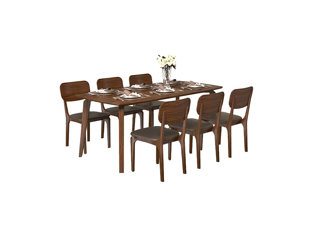 Bộ bàn ăn cao cấp chất liệu gỗ tự nhiên tần bì sơn màu hạt dẻ, mặt bàn được thiết kế vát cạnh và sơn màu óc chó.