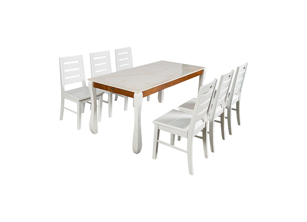 Bộ bàn ghế ăn gỗ tự nhiên sử dụng mặt bàn đá nhân tạo.