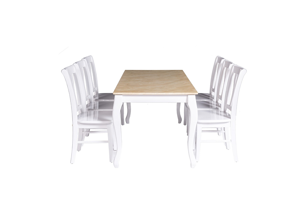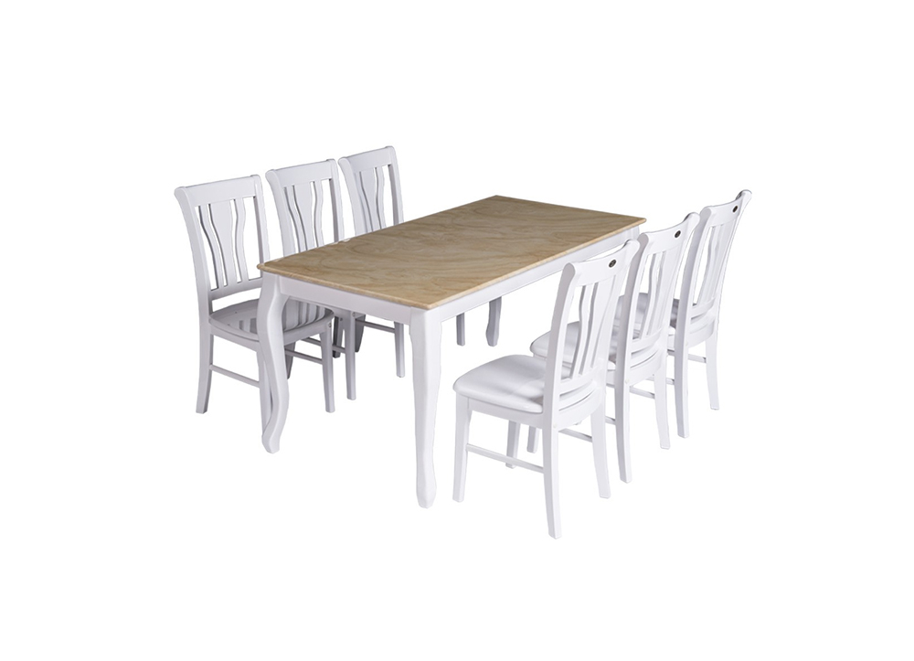 Bộ bàn ghế ăn cao cấp khung gỗ tự nhiên kết hợp mặt đá nhân tạo. Toàn bộ phần khung bàn, ghế được phủ một lớp sơn cao cấp tạo sự sang trọng, hiện đại cho sản phẩm
