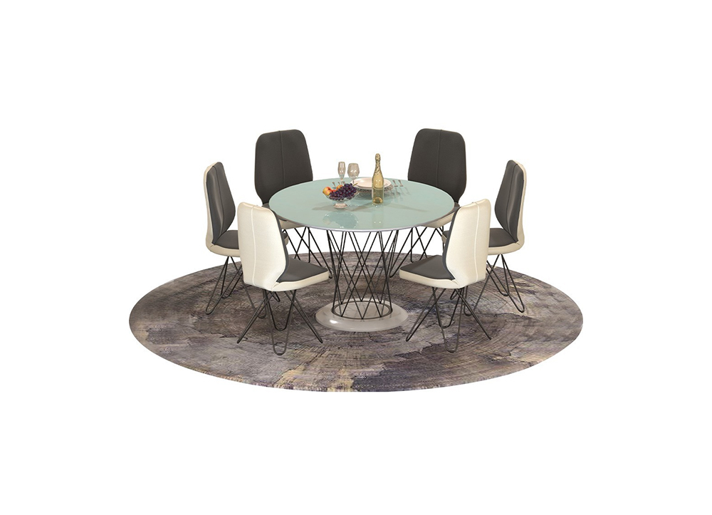 • Bàn ăn tròn kết hợp giữa gỗ công nghiệp và thép đặc Ø8 thiết kế đan xen phong cách hiện đại. Mặt kính cường lực dày 5mm.