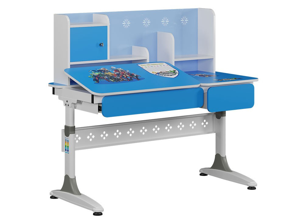 Bộ bàn học sinh khung thép sơn trắng gỗ melamine in hình con giống bắt mắt. Bàn có 2 ngăn kéo riêng biệt bên dưới mặt bàn, phía trên có 1 hộc cánh mở để đồ dùng học tập. Phần giá sách gỗ kết hợp tấm hậu tôn sơn tĩnh điện màu sắc bắt mắt với tùy chọn màu cho bé trai và bé gái.
