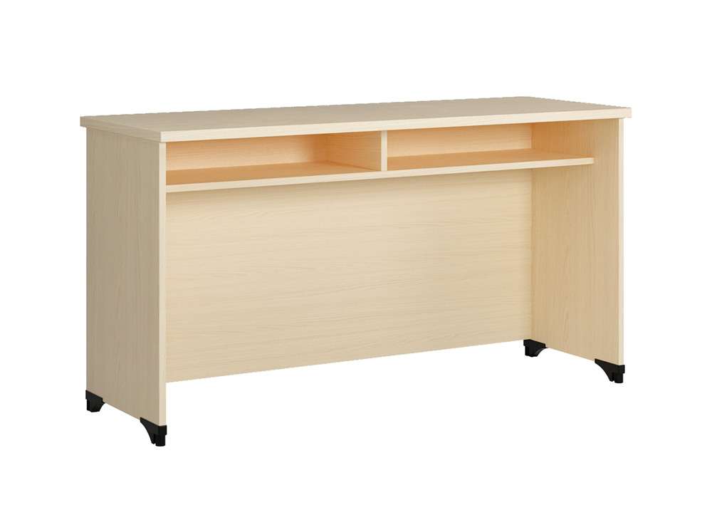 Bàn hội trường yếm sát đất, có đợt để tài liệu và có vách ngăn ở giữa đợt.