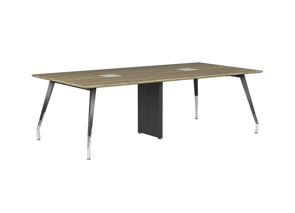 Bàn họp cao cấp mặt gỗ melamine vát cạnh 45 độ hai cạnh dài có 2 nắp ổ điện, kết hợp chân bàn thép dập định hình sơn đen nhám kết hợp mạ. Chân giữa tích hợp lỗ bắt ổ điện chờ