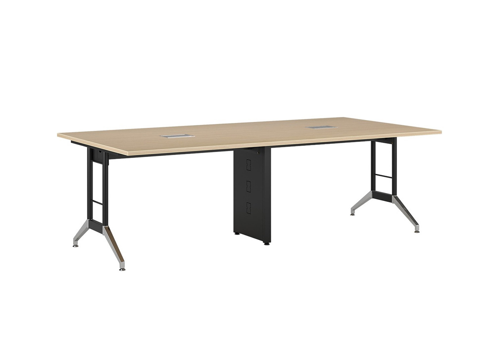 Bàn họp cao cấp mặt gỗ meleamin, kết hợp chân bàn ống thép sơn đen và mạ. Bàn có máng và hộp điện kết hợp làm khung giằng với kết cấu chắc chắn và tiện ích khi sử dụng.
