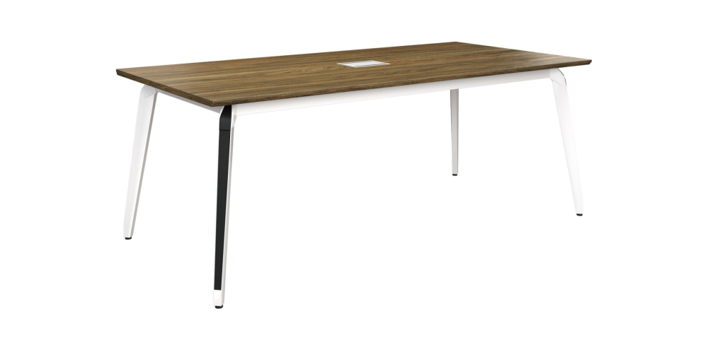 Bàn họp cao cấp mặt gỗ melamine vát cạnh 45 độ hai cạnh dài, bàn có 1 nắp ổ điện, kết hợp chân bàn thép dập định hình sơn trắng kết hợp ốp đen.