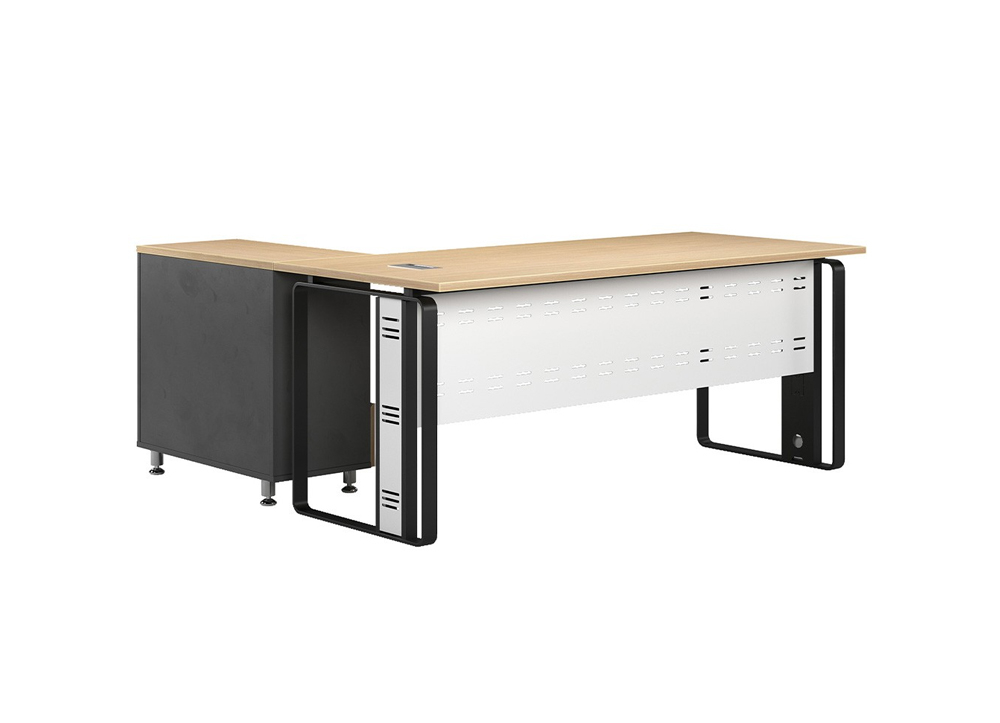 Bàn làm việc lãnh đạo sử dụng khung sắt 10x50 kết hợp hộp điện đi dây và tang cứng khung chân.