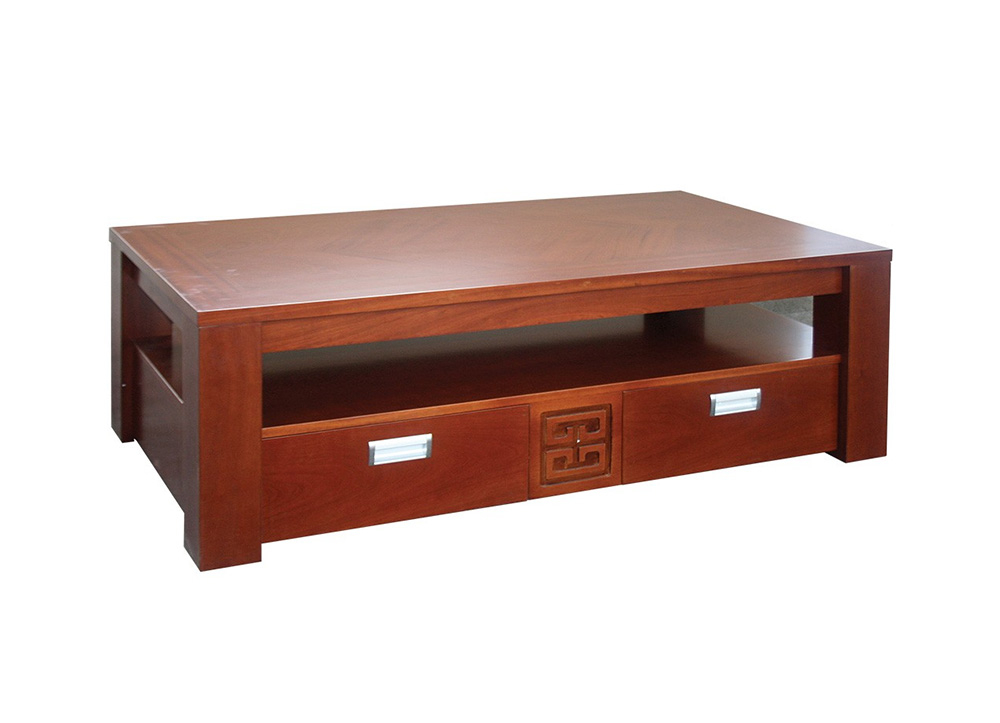 Bàn sofa mặt gỗ liền hình chữ nhật, chân bàn ghép hộp vuông. Bàn có 2 ngăn kéo