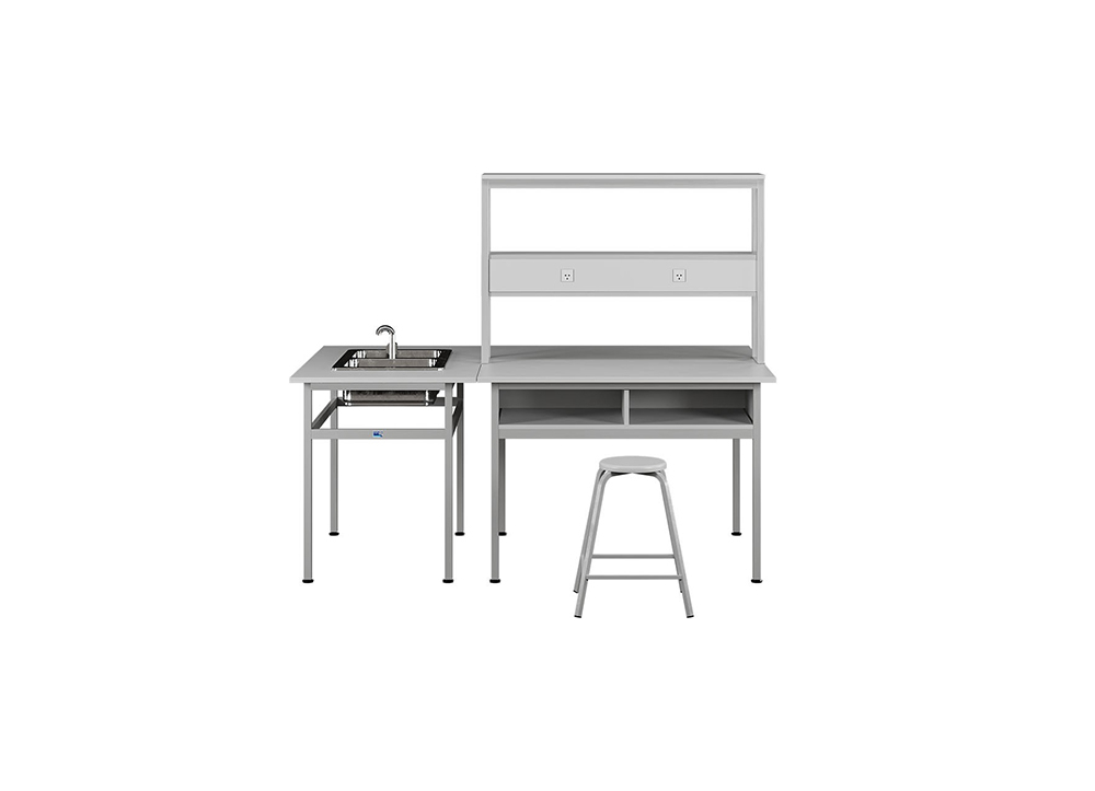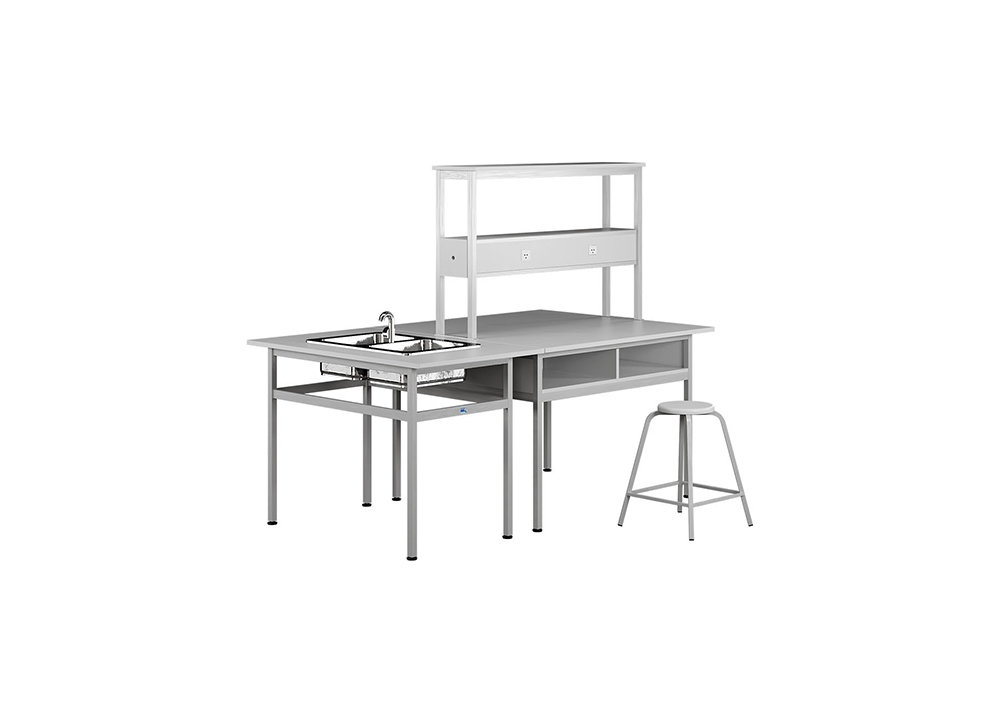 Bàn thí nghiệm hoá sinh có chậu rửa và vòi nước. Khung thép sơn tĩnh điện, mặt bàn composite, ngăn melamine. Có ổ cắm điện