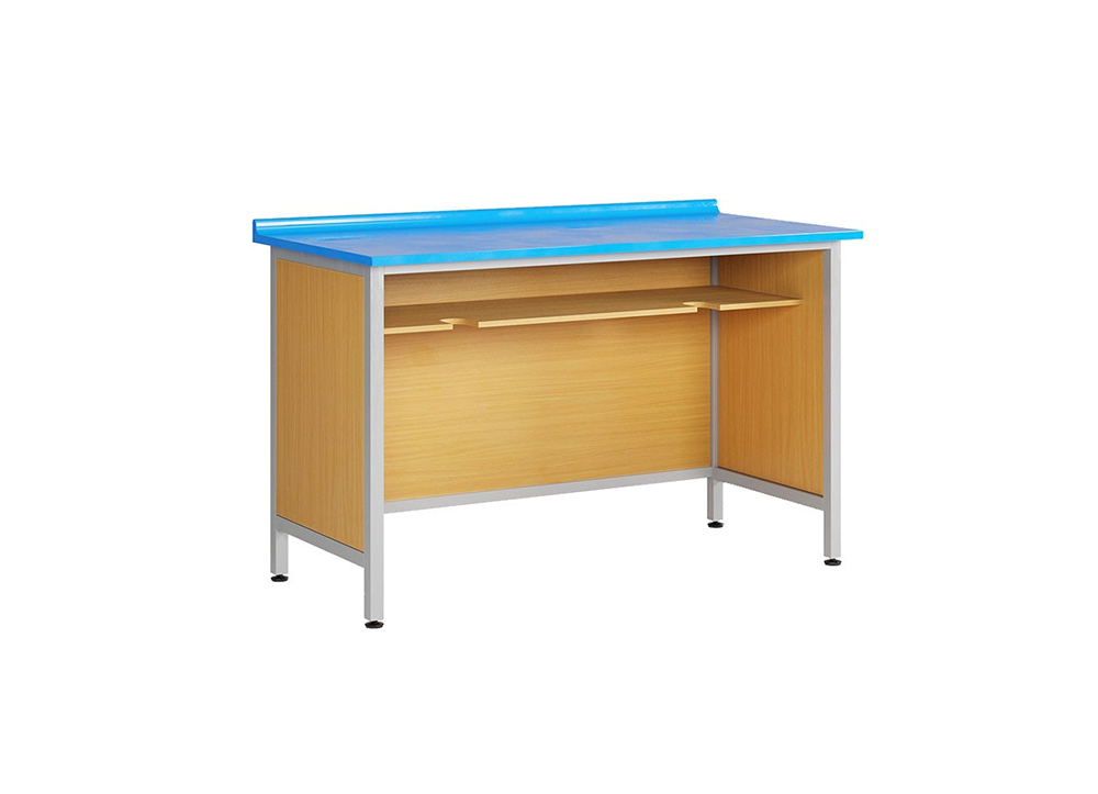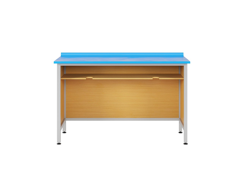 Bàn thí nghiệm hóa sinh 2 chỗ, khung thép sơn tĩnh điện. Mặt bàn composite có khả năng chống hóa chất kết hợp các chi tiết ốp vách melamine.