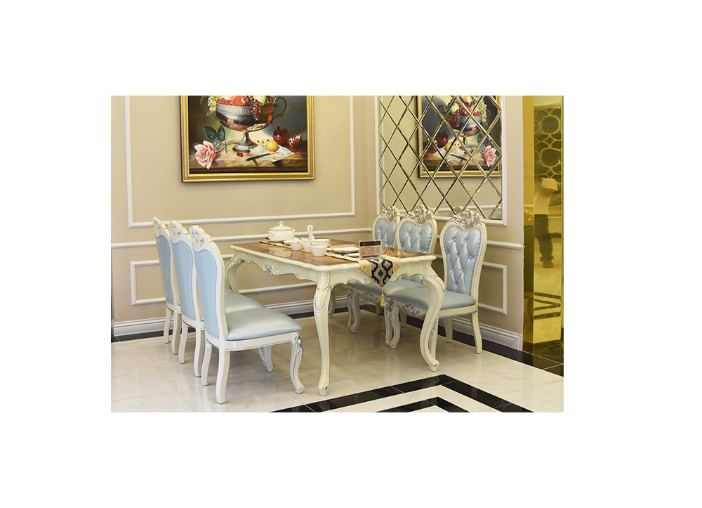 Bàn ăn BA203 tân cổ điển khung gỗ sồi sơn màu trắng ngọc trai. Mặt veneer đấu vân trang trí