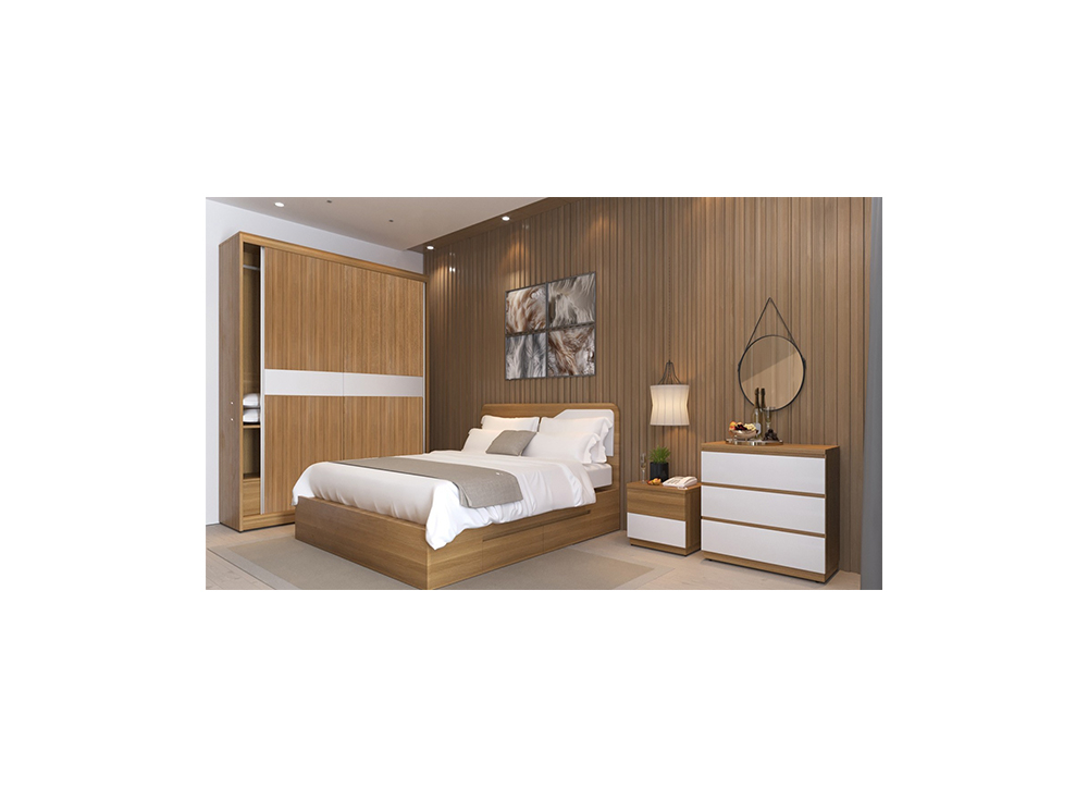 Giường phòng ngủ cao cấp gỗ công nghiệp Melamine kết hợp sơn PU. Giường có 02 ngăn kéo để đồ, nhằm tăng không gian sử dụng cho người dùng. (Một bộ bao gồm giường, tap đầu giường, tủ áo cánh lùa sử dụng ray cao cấp, bàn phấn.)