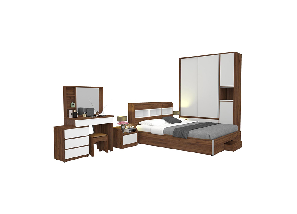 Bộ sản phẩm phòng ngủ người lớn, sử dụng chất liệu gỗ melamine cao cấp kết hợp giữa hai tông màu gỗ và trắng.