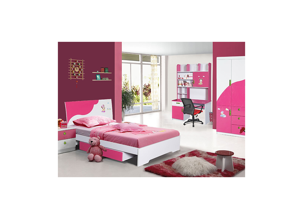 Bộ sản phẩm phòng ngủ trẻ em, sử dụng chất liệu gỗ melamine và sơn Pu cao cấp kết hợp giữa hai tông màu hồng và trắng.