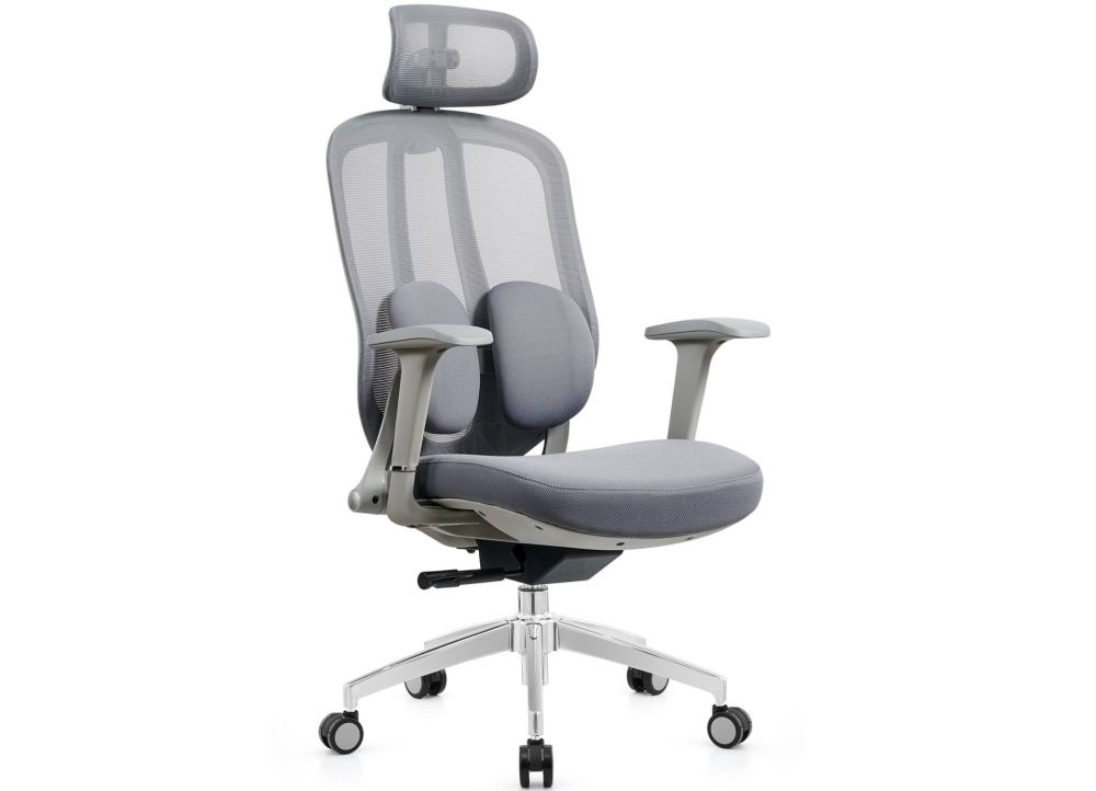 Ghế công thái học, đệm ghế sử dụng mút đúc bọc vải mềm mại, êm ái, khung tựa nhựa bọc vải lưới. Ghế có thể ngả hãm tại 3 vị trí, phần eo tựa có thể điều chỉnh được để hỗ trợ cột sống. Tựa đầu có thể điều chỉnh góc độ và chiều cao. Tay ghế chữ T cố định. Chân thép mạ.