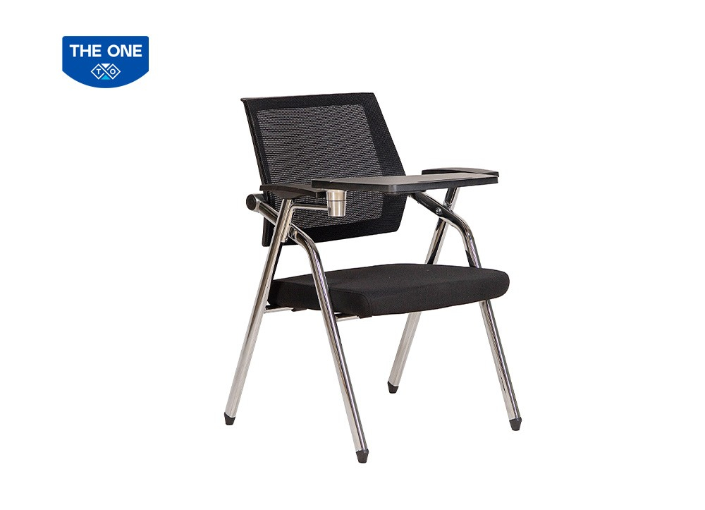Ghế hội thảo, khung tựa nhựa bọc vải lưới và có bàn viết bằng nhựa đen.