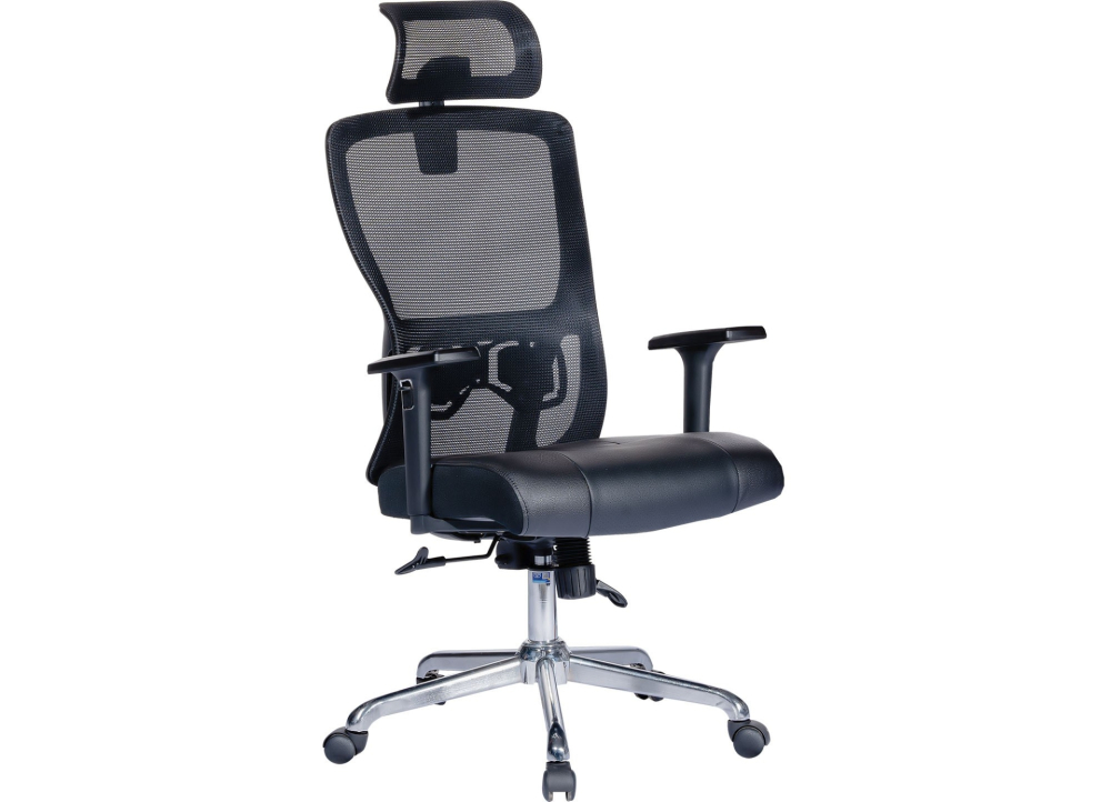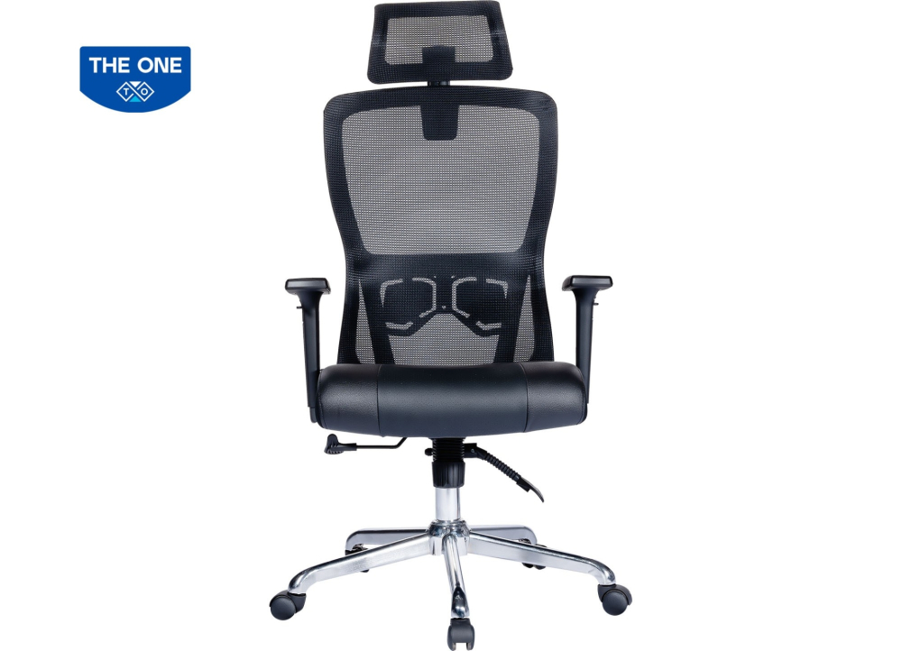 Ghế lưới lưng cao, khung tựa nhựa bọc vải lưới, đệm bọc PVC may trang trí. Ghế có khả năng điều chỉnh độ cao và độ ngả tựa, tay chữ T tăng chỉnh được chiều cao. Chân thép mạ