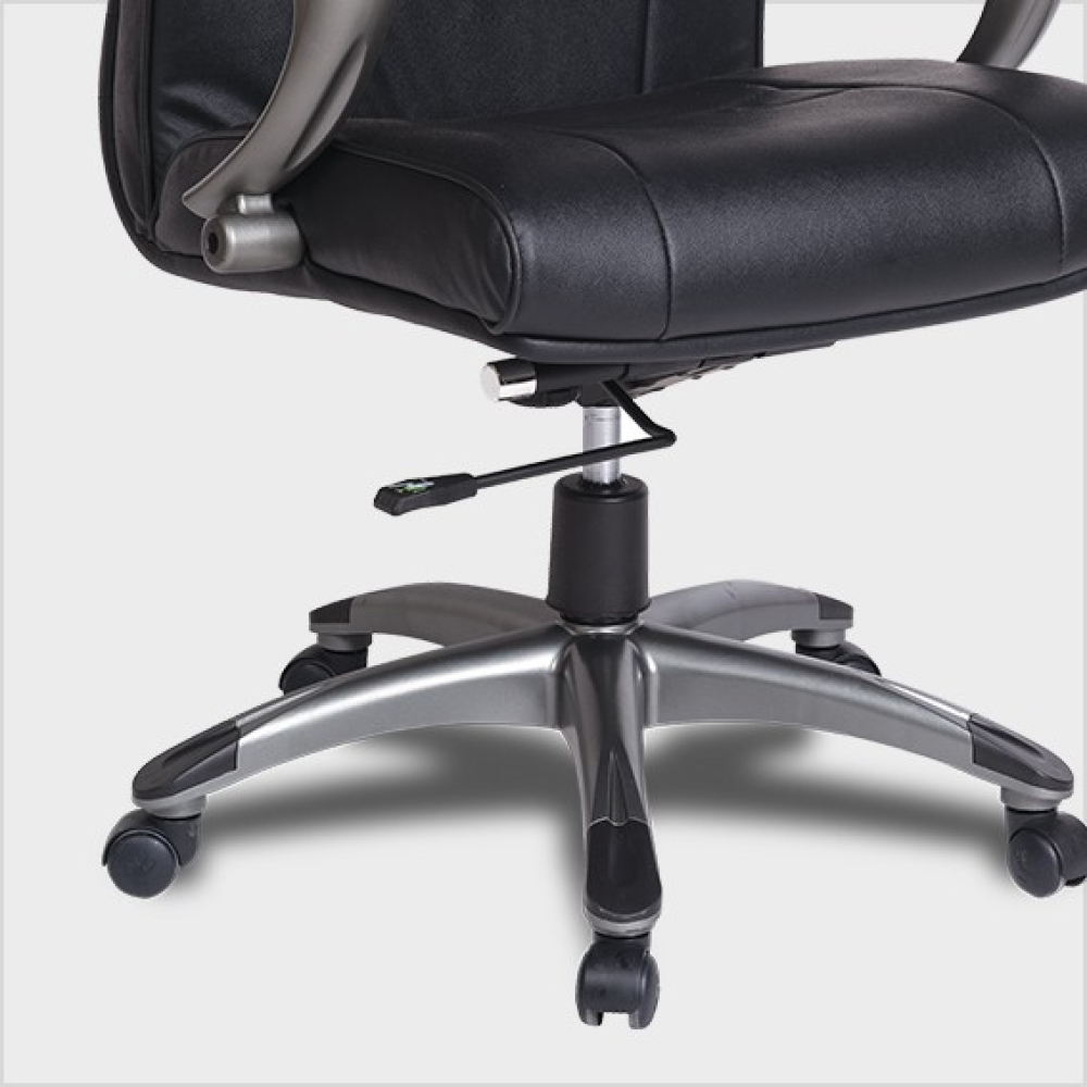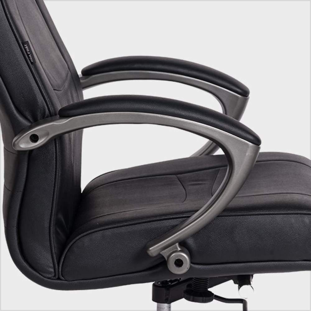 Ghế lãnh đạo có đệm tựa bọc da, da CN hoặc PVC. Chân tay nhựa sơn phủ mầu nhũ chì hoặc nhũ đồng.