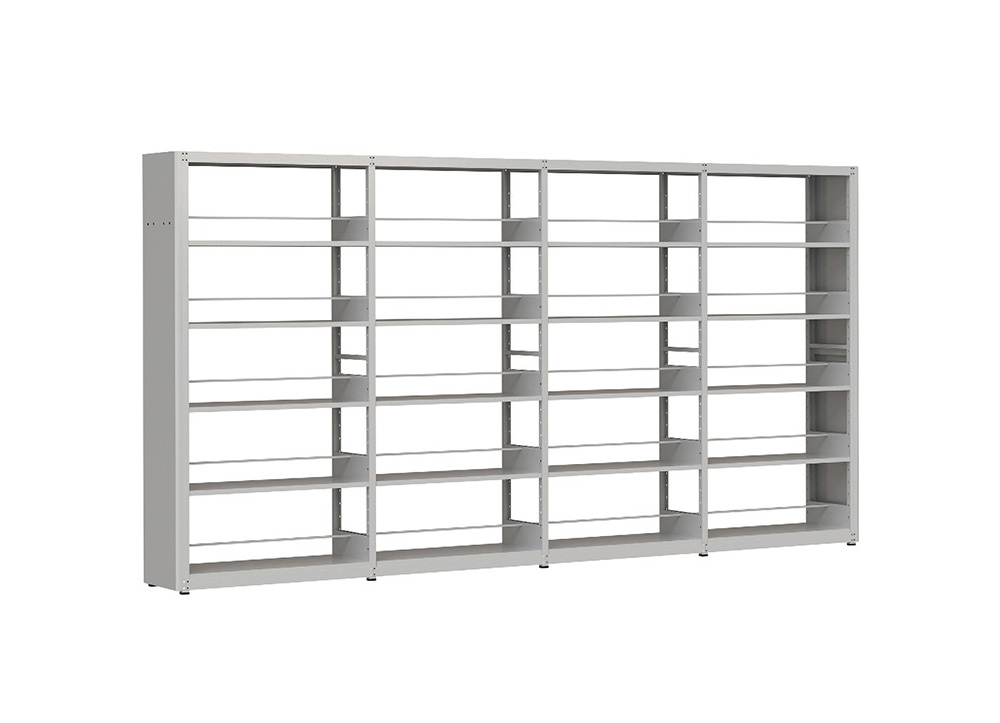 Giá thư viện 4 khoang sử dụng 2 mặt, có 5 tầng để tài liệu. Các đợt và thanh chắn có thể di động giúp điều chỉnh độ cao.