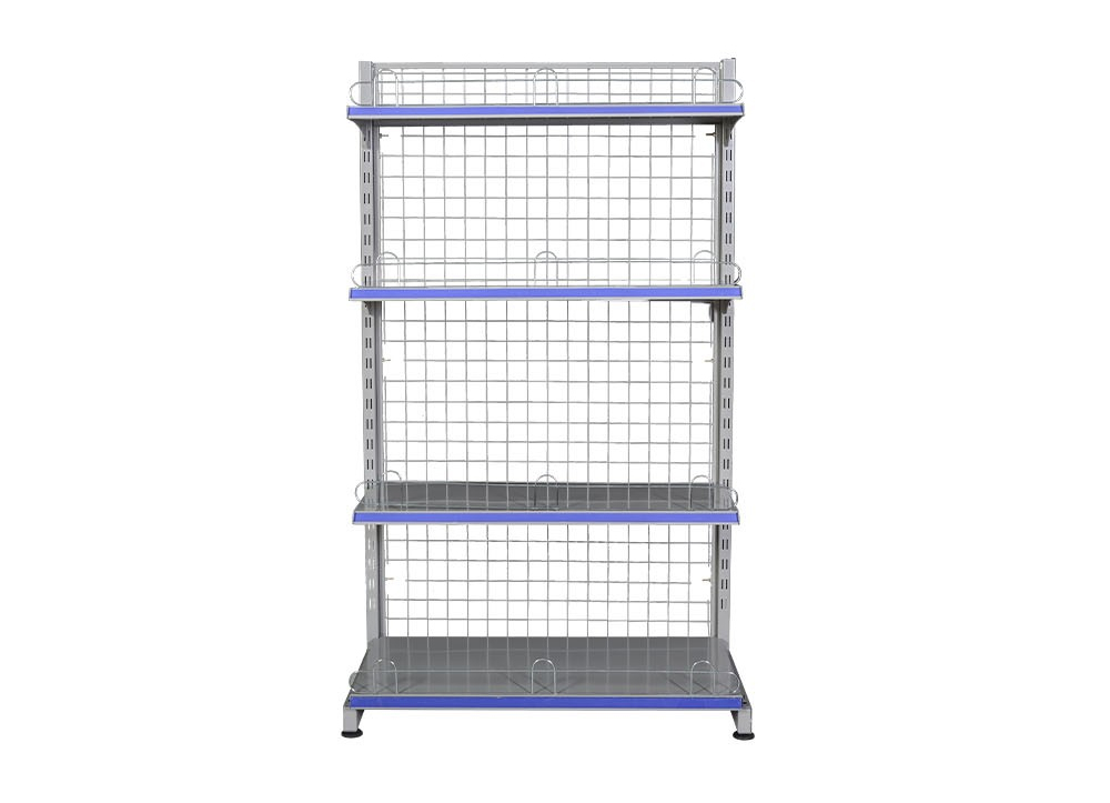 Giá siêu thị để hàng 2 mặt khung thép sơn tĩnh điện, mỗi mặt có 5 tầng đề đồ (gồm đáy và đợt).