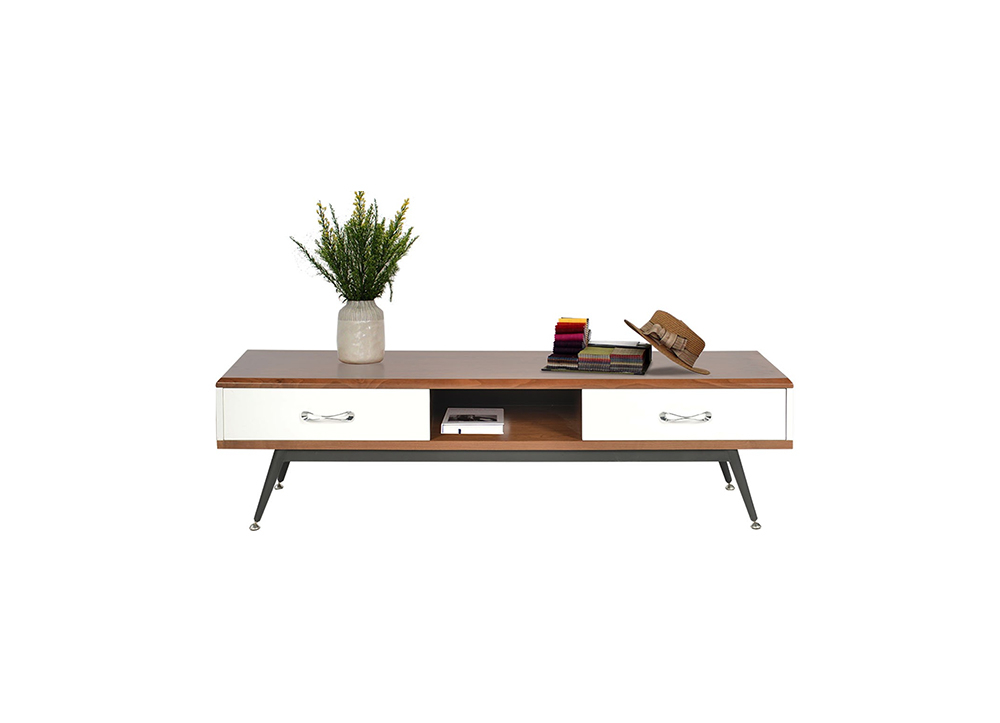 Kệ ti vi cao cấp khung thép sơn tĩnh điện, phần gỗ sử dụng chất liệu Veneer óc chó kết hợp gỗ công nghiệp sơn trắng High Glossy.