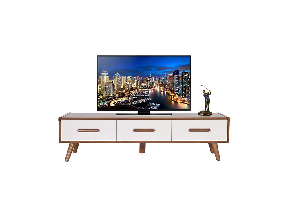 Kệ ti vi cao cấp sử dụng chất liệu Veneer kết hợp gỗ tự nhiên, phần mặt ngăn kéo bằng gỗ công nghiệp sơn High Glossy trắng bóng.