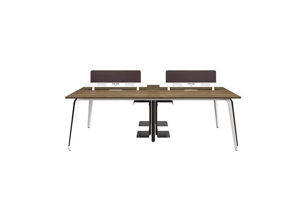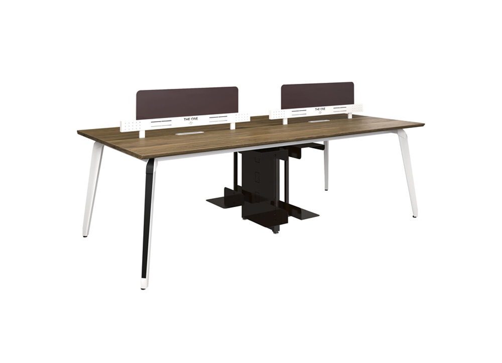 Modul làm việc 4 chỗ. Mặt bàn vát cạnh 45 độ hai cạnh dài, Bàn có vách giữa dạng hộp đi dây điện giúp tăng cứng vững cho bàn. Mặt bàn gồm 2 nắp luồn dây chung và vách ngăn kiểu mới, dạng ống khắc laze trang trí. Chân bàn thép dập định hình sơn trắng kết hợp ốp đen.