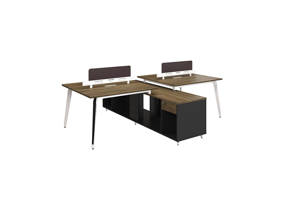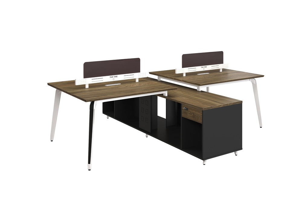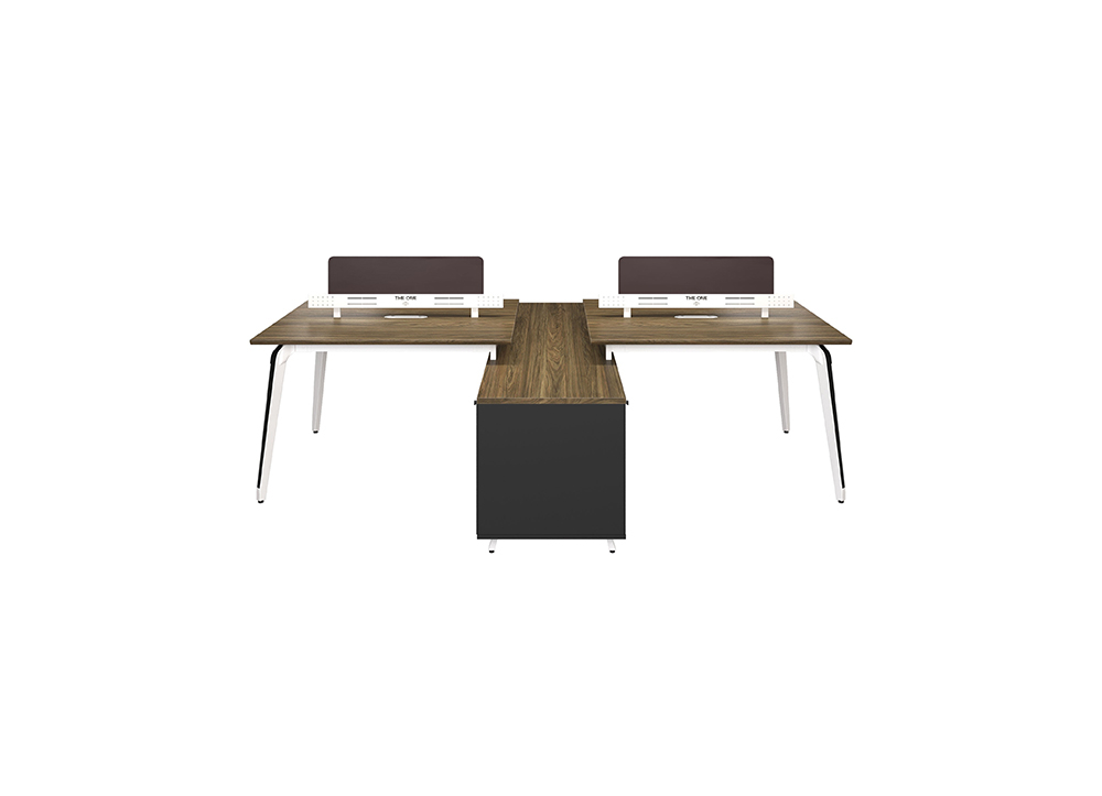 Modul làm việc 4 chỗ có tủ phụ liền bàn mỗi vị trí có 1 ngăn kéo sử dụng khóa số, khoang để tài liệu và CPU, phần gầm có sẵn vị trí đột chờ để bắt ổ điện. Mặt bàn vát cạnh 45 độ hai cạnh dài, có nắp luôn dây chung và vách ngăn kiểu mới, dạng ống khắc laze trang trí. Chân bàn thép dập định hình sơn trắng kết hợp ốp đen.