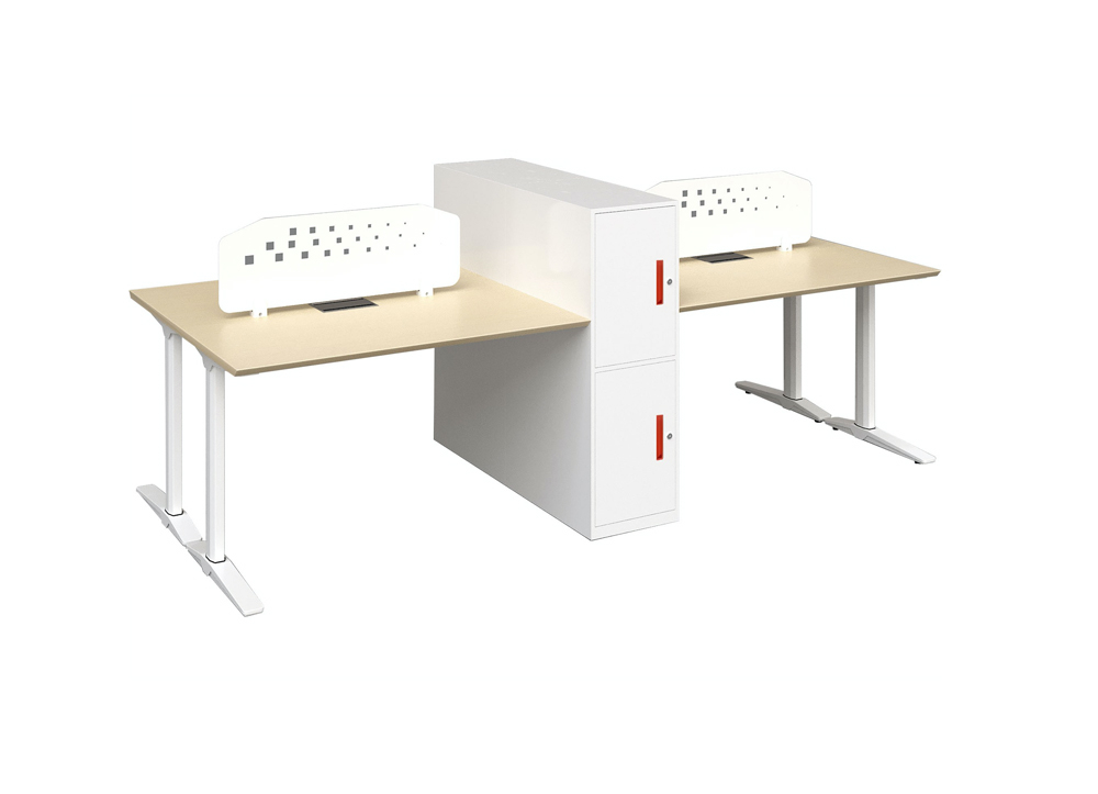 Bàn làm việc chữ nhật cho 4 người , toàn bộ phần chân, vách ngăn và tủ sơn màu S26, tay nắm âm màu cam. Mặt bàn màu M14, có vát cạnh 45 độ phía người ngồi.