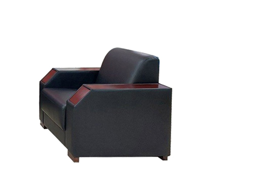 Bộ ghế sofa văn phòng kiểu dáng hiện đại, đệm tựa bọc da thật phần tiếp xúc người sử dụng hoặc PVC. Tay sofa có biên dạng vát, có ốp sơn chìm xuống bề mặt tay. Đế chân gỗ sơn