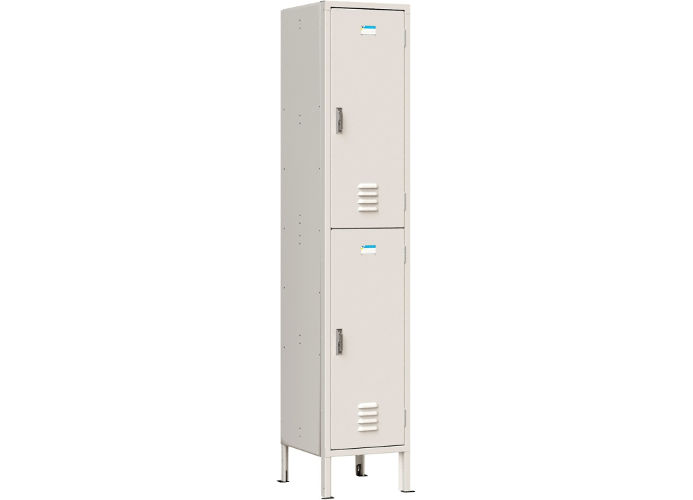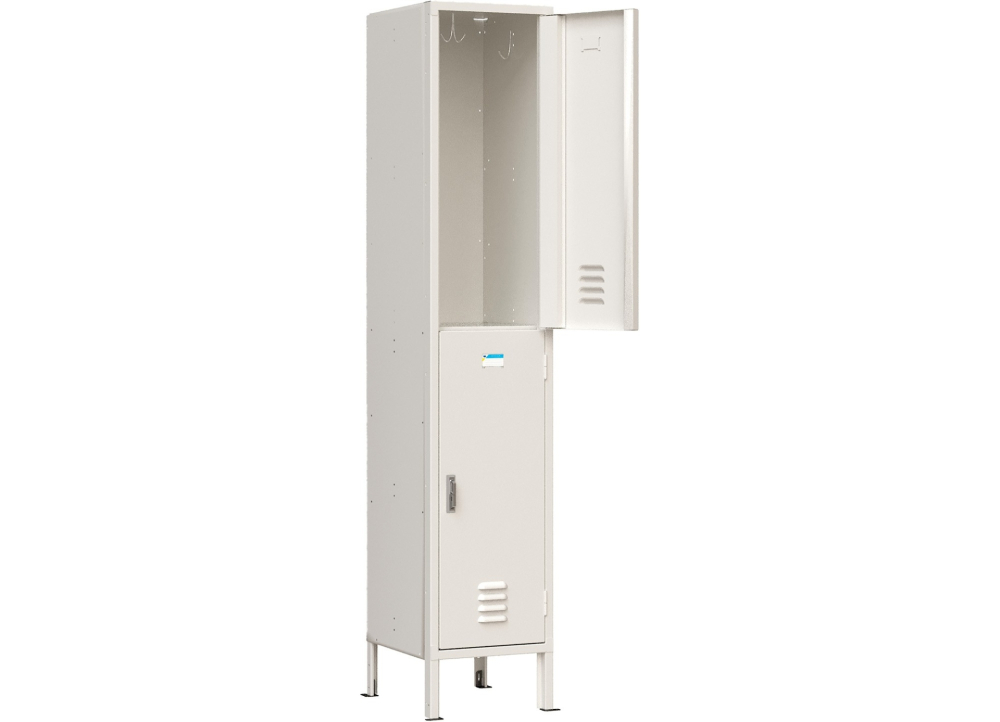 Tủ sắt sơn tĩnh điện màu trắng ngà. Tủ có 2 khoang cánh mở, bên trong mỗi khoang 3 móc treo áo đơn, 1 móc treo áo đôi. Cánh sử dụng tay