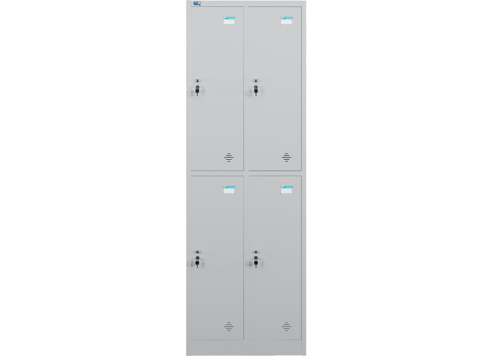 Tủ sắt sơn tĩnh điện 4 khoang cánh mở, bên trong mỗi khoang có 1 đợt cố định và 1 suốt treo quần áo. Trên mỗi cánh có 1 khóa Locker, núm tay nắm và tai khóa móc.
