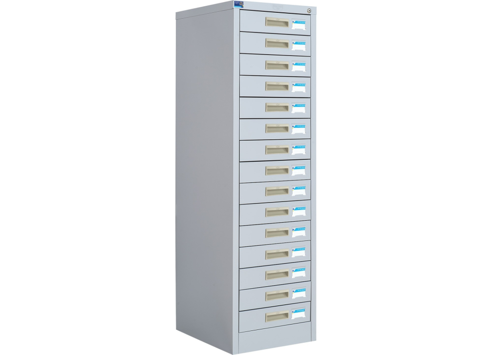 Tủ sắt sơn tĩnh điện gồm 15 ngăn kéo chuyển động bằng cơ cấu ray thép uốn.