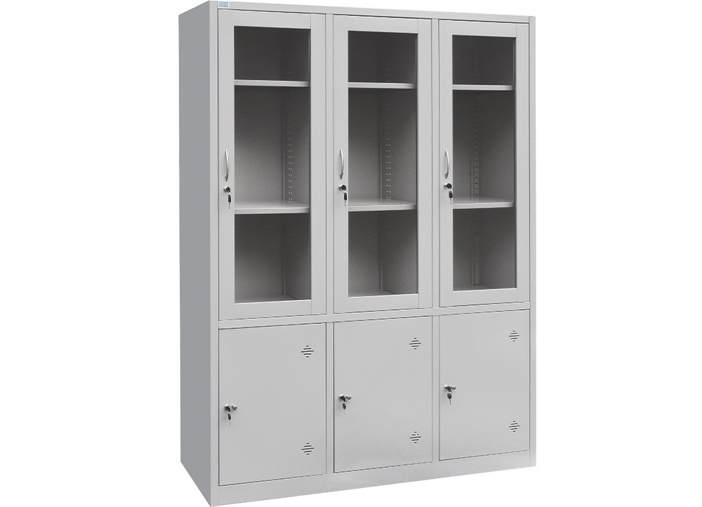 Tủ sắt sơn tĩnh điện gồm 6 khoang, bên trên là 3 khoang cánh kính mỗi khoang có 2 đợt di động, bên dưới 3 khoang cánh sắt