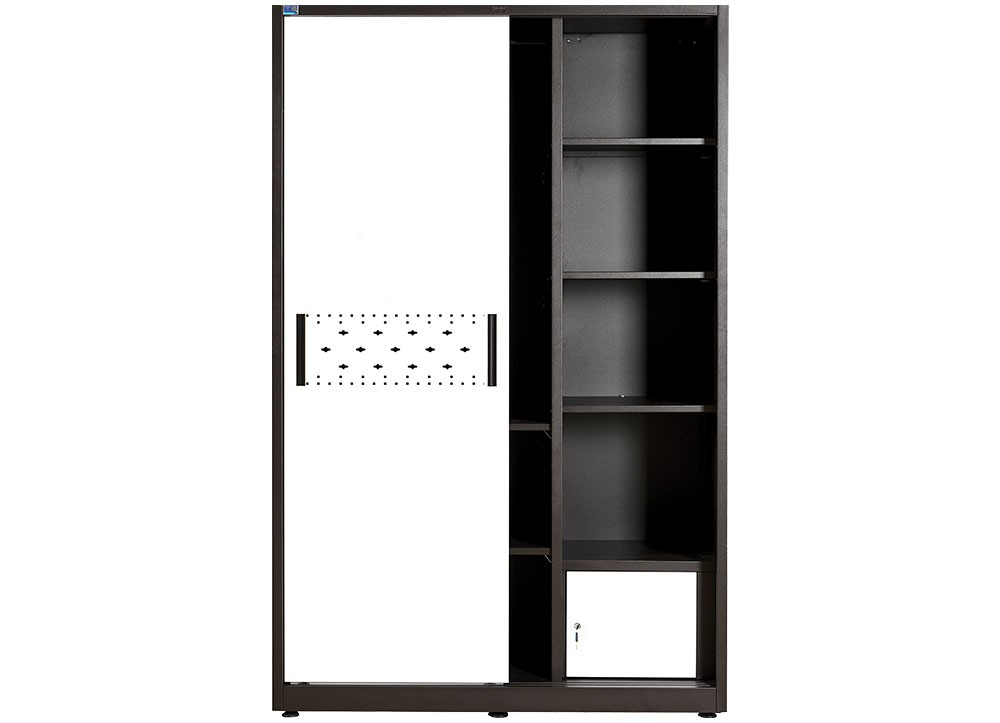 Tủ sắt gia đình 2 cánh lùa thân sơn màu cà phê kết hợp cánh mầu trắng có hoa văn trang trí hiện đại.
