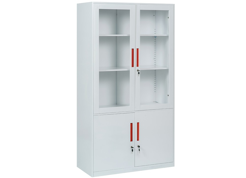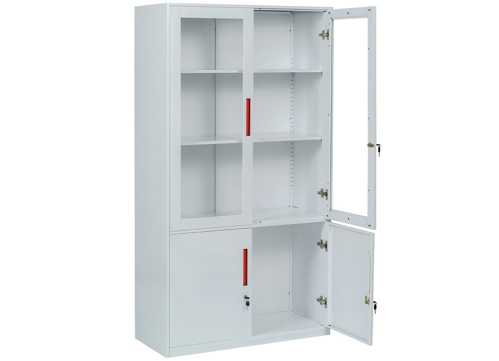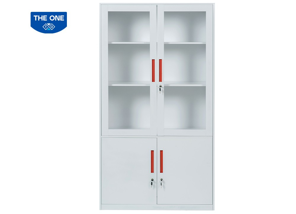Tủ có khoang trên là cánh kính với 2 đợt di động, khoang dưới 2 cánh sắt mở.
