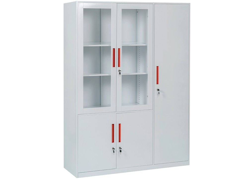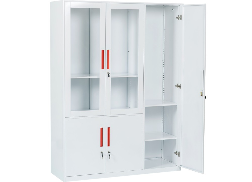 Tủ được thiết kế gồm 3 khoang với 1 khoang cánh kính mở có 2 đợt di động, khoang bên dưới là 2 cánh sắt mở và 1 khoang cánh mở dài có suốt treo quần áo, 2 đợt cố định.
