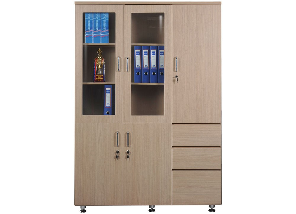 Tủ tài liệu 3 khoang, phía trên gồm 2 khoang cánh kính để tài liệu và 1 khoang treo áo, phía dưới có 3 ngăn kéo và hai cánh mở.