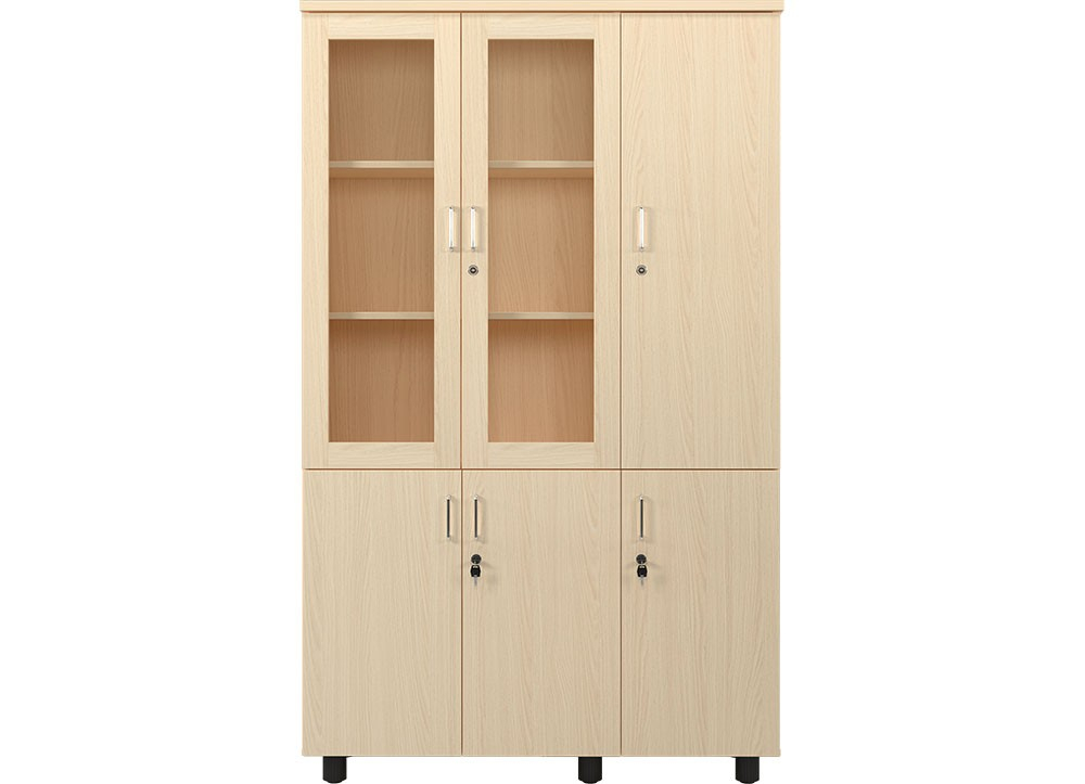 Tủ tài liệu 3 khoang sử dụng gỗ công nghiệp Melamine. Phía trên có 2 cánh kính để tài liệu và 1 khoang treo áo, phía dưới có 3 cánh mở.