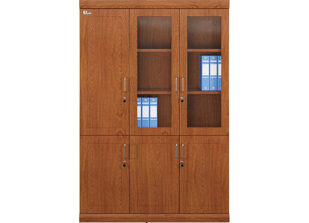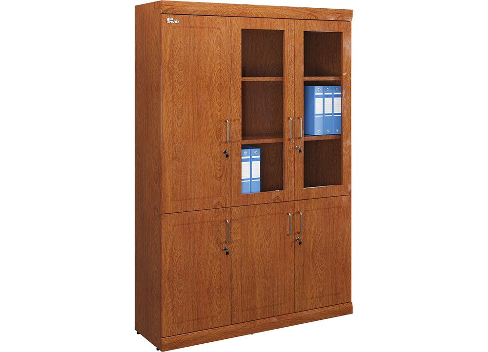 Tủ tài liệu 3 khoang, phía trên có 2 khoang cánh khung kính, 1 khoang cánh dài, phía dưới 3 cánh gỗ.