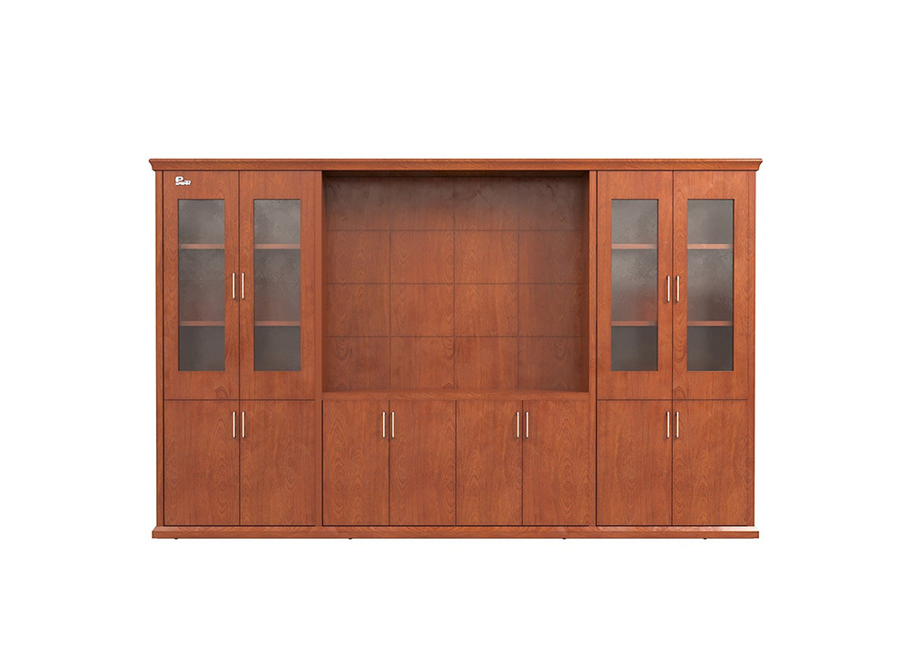 Tủ tài liệu gồm 8 khoang, phía dưới cánh gỗ mở, phía trên khung cánh kính, phần giữa để khoang trống