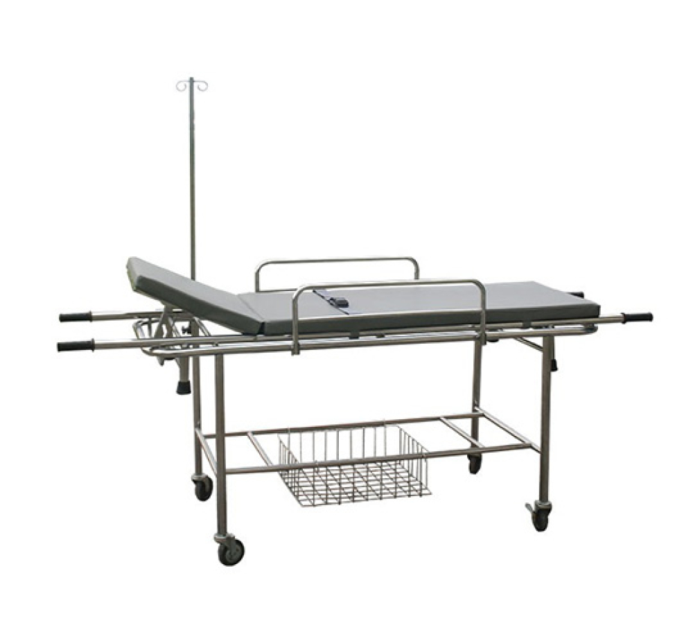Xe đẩy cáng khung bằng Inox chân gắn bánh xe, có 1 giỏ chứa đồ ở dưới và 1 cọc truyền tăng chỉnh được chiều cao.
