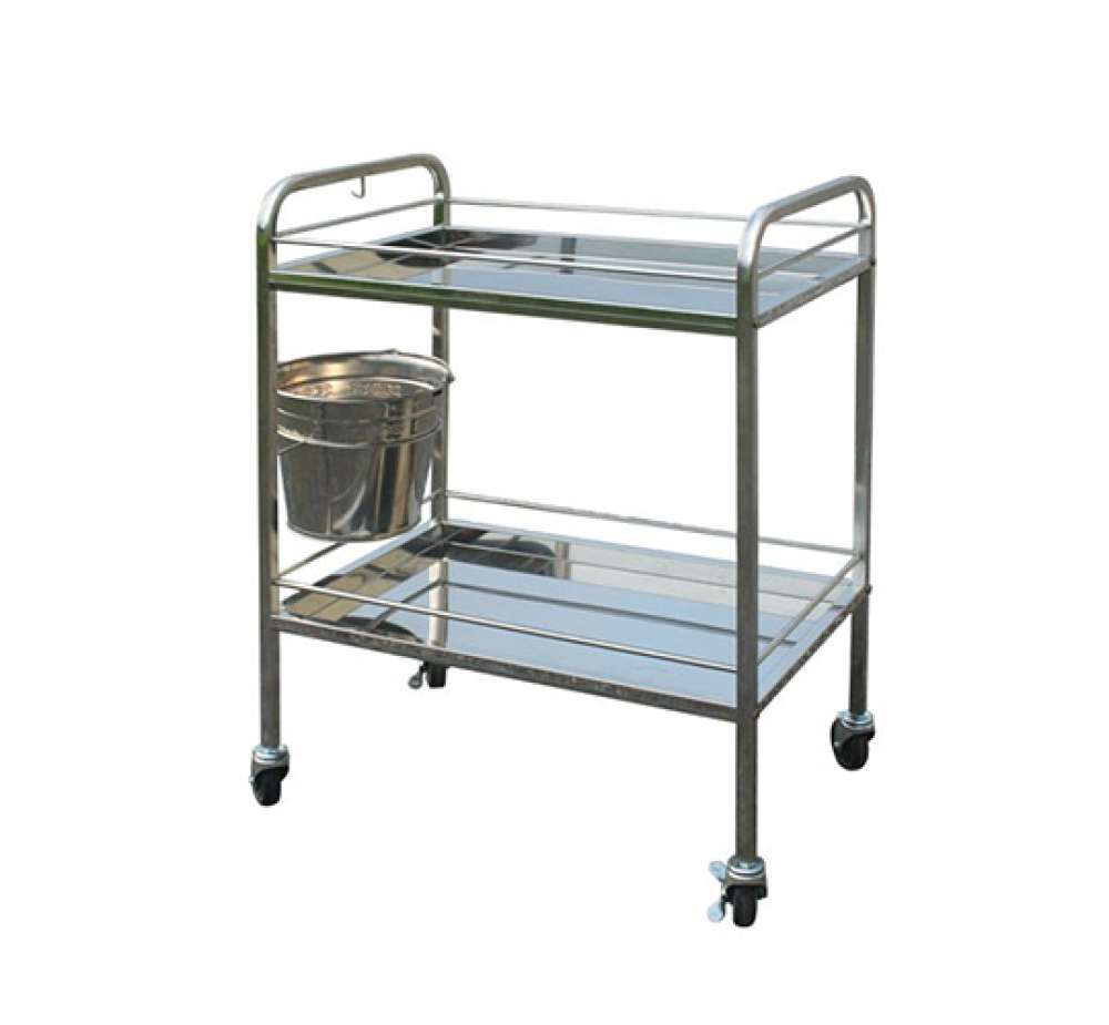 Xe đẩy dụng cụ y tế có 2 tầng toàn bộ khung bằng Inox, thành xe có móc treo đồ và một vòng tròn để xô chứa rác y tế